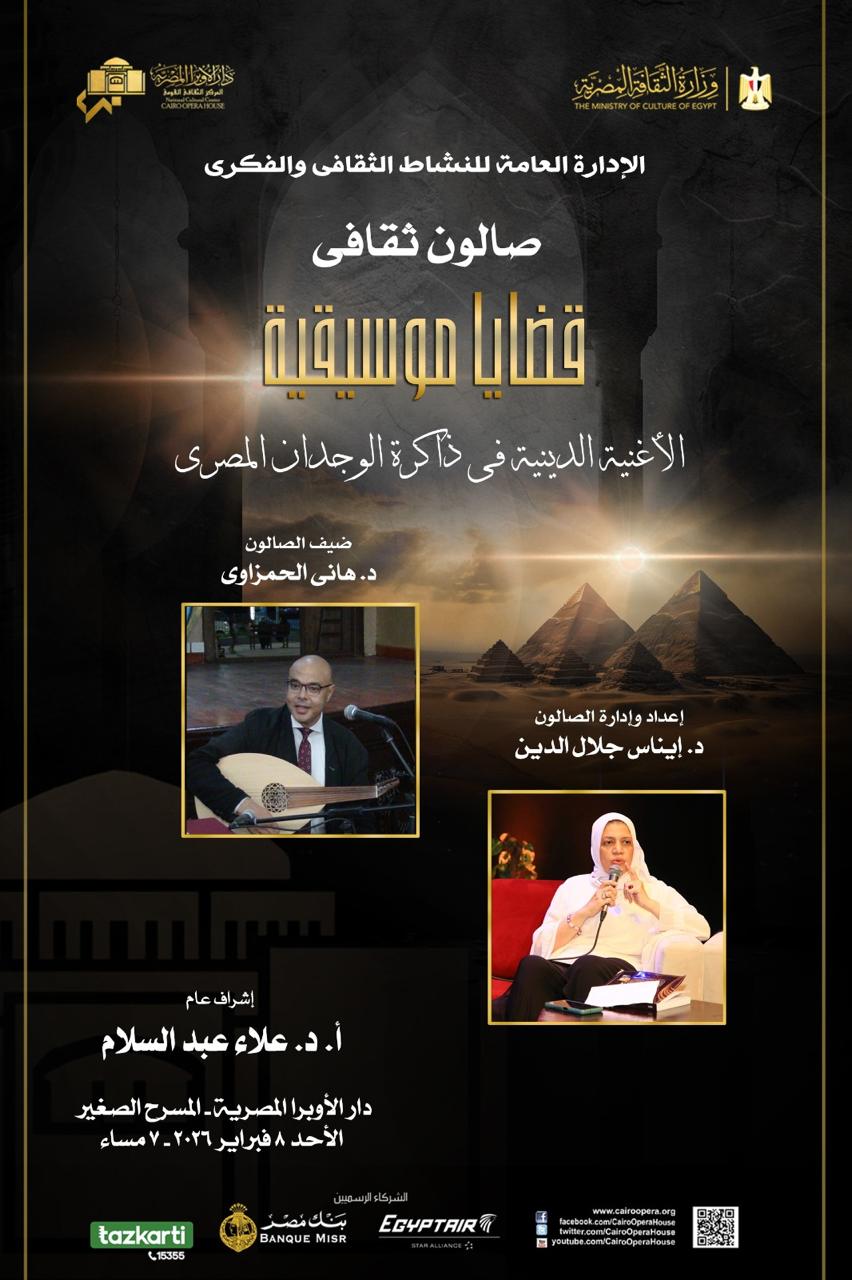إستعداداً لاستقبال شهر رمضان المعظم تعقد دار الأوبرا المصرية برئاسة الدكتور علاء عبد السلام ضمن نشاطها الثقافى والفكرى بإشراف رشا الفقى أمسية من سلسة حلقات صالون قضايا موسيقية وتتناول الأغنية الدينية فى ذاكرة الوجدان المصرى إعداد وتقديم الناقدة الموسيقية الدكتورة إيناس جلال الدين وتستضيف الدكتور هانى الحمزاوى وفرقته الموسيقية وذلك فى السابعة مساء الأحد ٨ فبراير على المسرح الصغير ويتخللها مجموعة المؤلفات الروحانية والرمضانية الشهيرة منها البردة، هلت ليالى، رمضان جانا، طلع البدر علينا، عليك صلاة الله وسلامه، وحوي يا وحوي، ماشى فى نور الله، إلى جانب عملين من ألحانه وكلمات الشاعرة ريهام عبدالله هما زينة وأنوار، وأحلى الأيام .