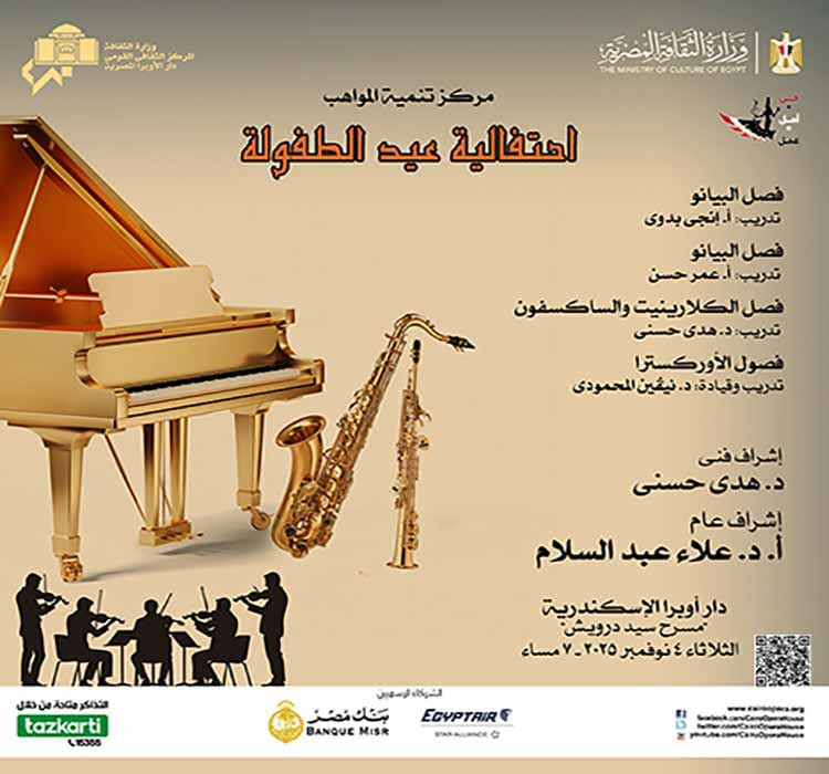 تحتفل دار الأوبرا المصرية برئاسة الدكتور علاء عبد السلام بأعياد الطفولة خلال حفل للواعدين بمركز تنمية المواهب بأوبرا الأسكندرية بإشراف الدكتورة هدى حسنى وذلك فى السابعة مساء الثلاثاء 4 نوفمبر على مسرح سيد درويش ” أوبرا الإسكندرية ” .