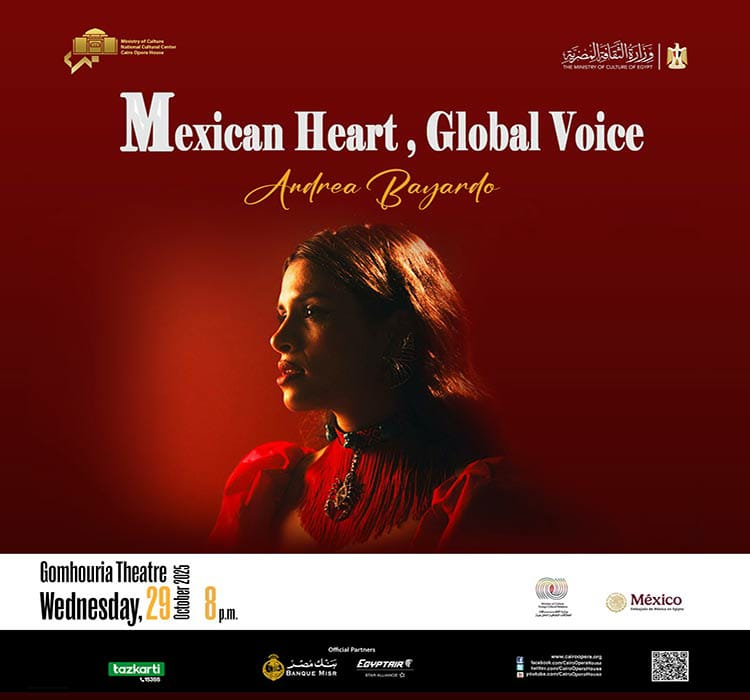 تستضيف دار الأوبرا المصرية برئاسة الدكتور علاء عبد السلام بالتعاون مع قطاع العلاقات الثقافية الخارجية وسفارة المكسيك بالقاهرة حفلا غنائياً بعنوان قلب مكسيكى.. وصوت عالمى ” للمغنية أندريا باياردو وذلك في الثامنة مساء الأربعاء 29 اكتوبر على مسرح الجمهورية .