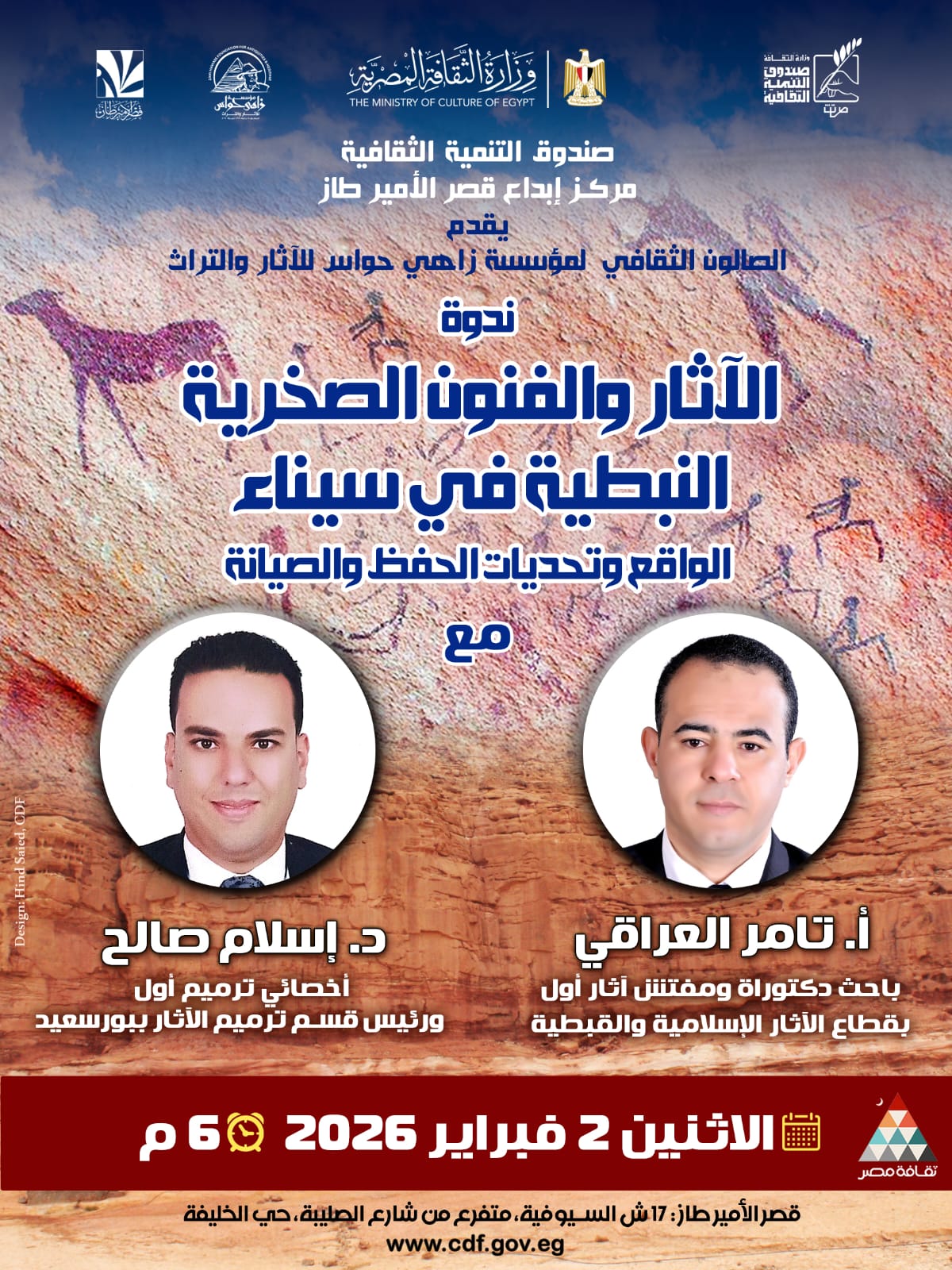 في إطار الدور الثقافي والتنويري الذي يضطلع به صندوق التنمية الثقافية في الحفاظ على التراث ونشر الوعي الأثري، ينظم مركز إبداع قصر الأمير طاز بالسيوفية، التابع لصندوق التنميةالثقافية، وبالتعاون مع مؤسسة زاهي حواس للآثار والتراث، ندوة تثقيفية بعنوان «الآثار والفنون الصخرية النبطية في سيناء»، وذلك غدًا الاثنين الموافق 2 فبراير، في تمام الساعة السادسة مساءً.