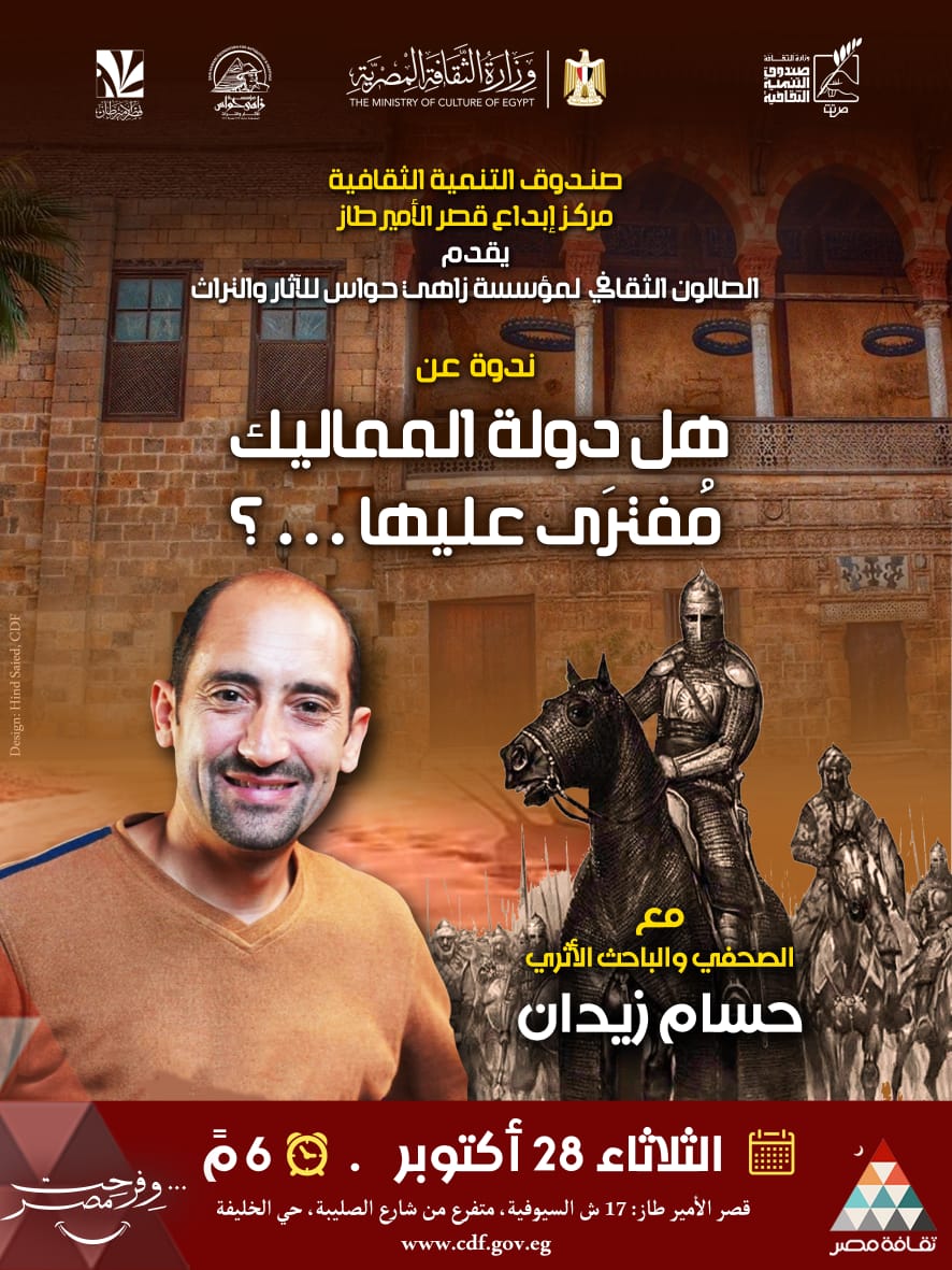 في إطار حرص وزارة الثقافة على تعزيز الوعي بالتاريخ والتراث المصري، ينظم قطاع صندوق التنمية الثقافية من خلال مركز إبداع قصر الأمير طاز بحي الخليفة ندوة بعنوان «دولة المماليك بين الإنصاف والافتراء»، وذلك في السادسة مساء غداً (الثلاثاء 28 أكتوبر)، ضمن فعاليات الصالون الثقافي لمؤسسة زاهي حواس للآثار والتراث.