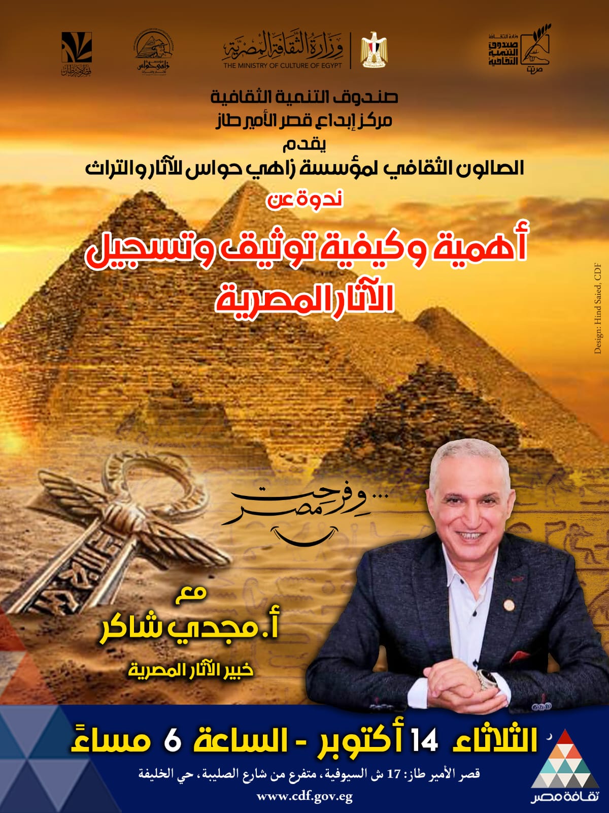 يُحاضر في الندوة الأستاذ مجدي شاكر، كبير الأثريين بوزارة السياحة والآثار، وأحد أبرز الباحثين المتخصصين في شرح وتبسيط التاريخ والآثار المصرية، والذي قدّم خلال مسيرته العديد من المحاضرات والبرامج التوعوية في مصر وخارجها، مسلطًا الضوء على عظمة الحضارة المصرية القديمة وضرورة الحفاظ على تراثها المادي واللامادي.