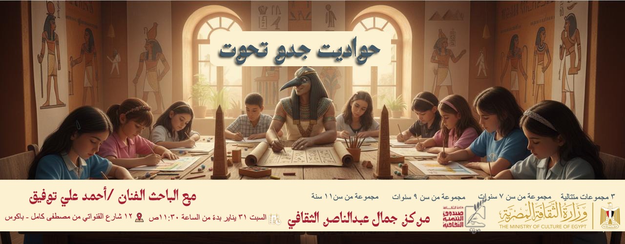 ينظم مركز جمال عبد الناصر الثقافي، التابع لقطاع صندوق التنمية الثقافية، ورشة فنية للأطفال بعنوان «حواديت جدو تحوت»، وذلك في إطار استراتيجية وزارة الثقافة الهادفة إلى تنمية وعي النشء بالهوية المصرية، وتعميق ارتباطهم بالتراث الأدبي للحضارة المصرية القديمة من خلال مقاربات إبداعية وتفاعلية.